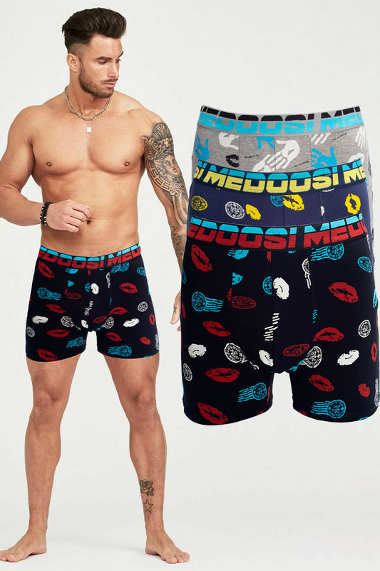 Dollcini Légáteresztő Pamut Férfi Boxeralsó - 95% Pamut, Csókmintás, 3 darabos szett