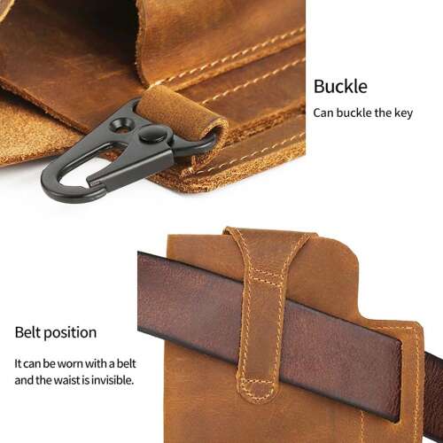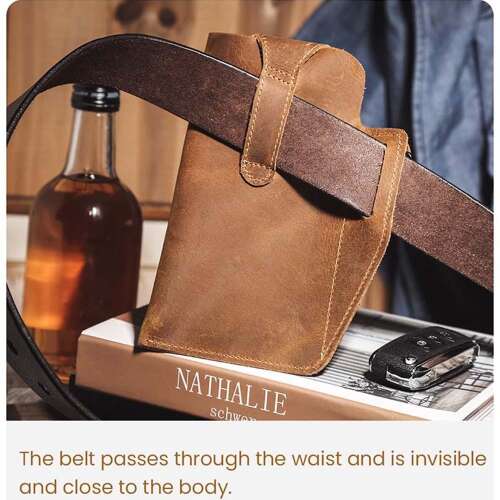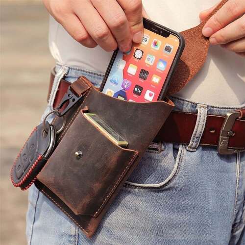 Această husă din piele pentru telefonul mobil pentru bărbați este o soluție practică și elegantă pentru depozitarea și transportul obiectelor esențiale de zi cu zi.