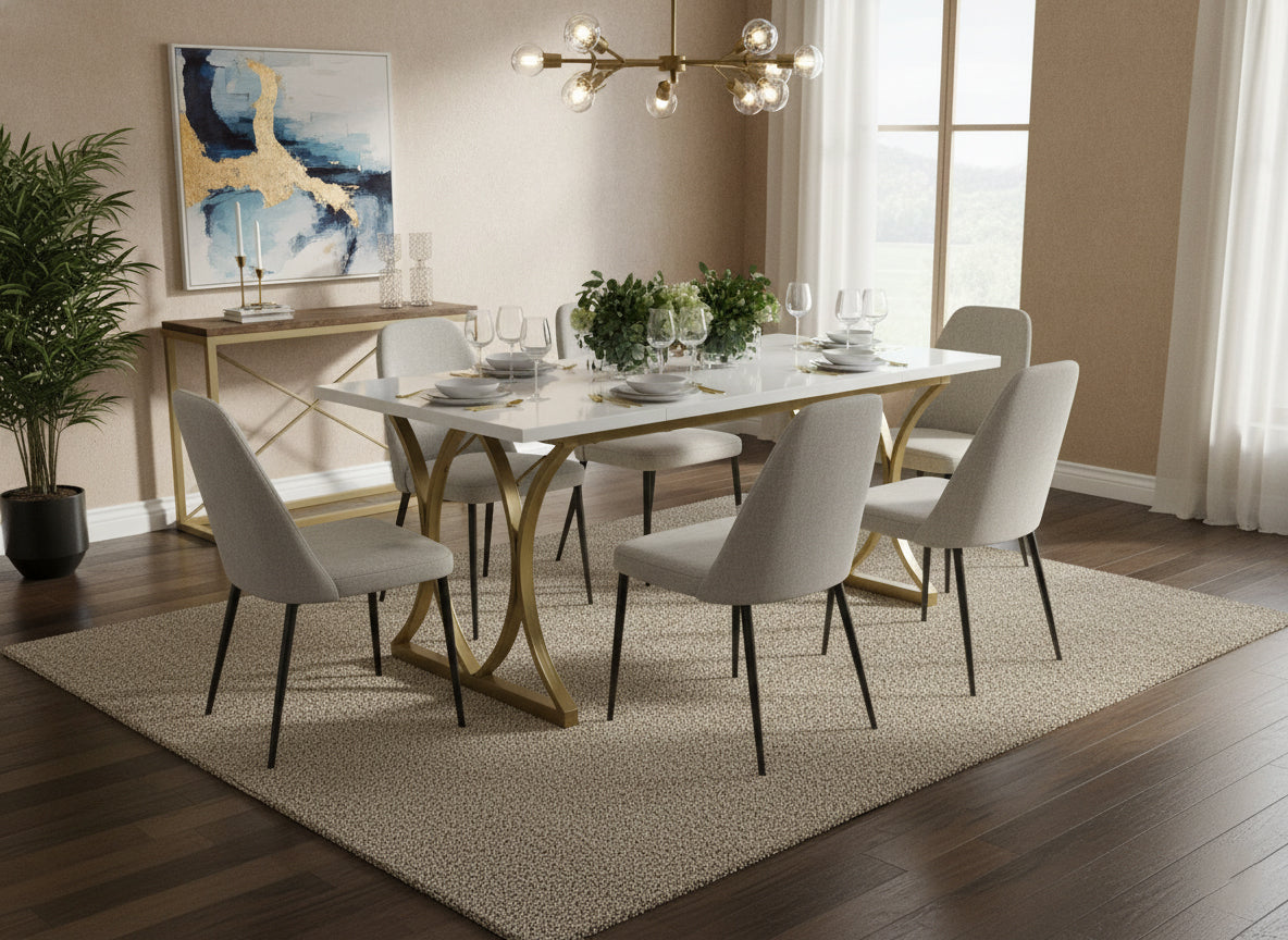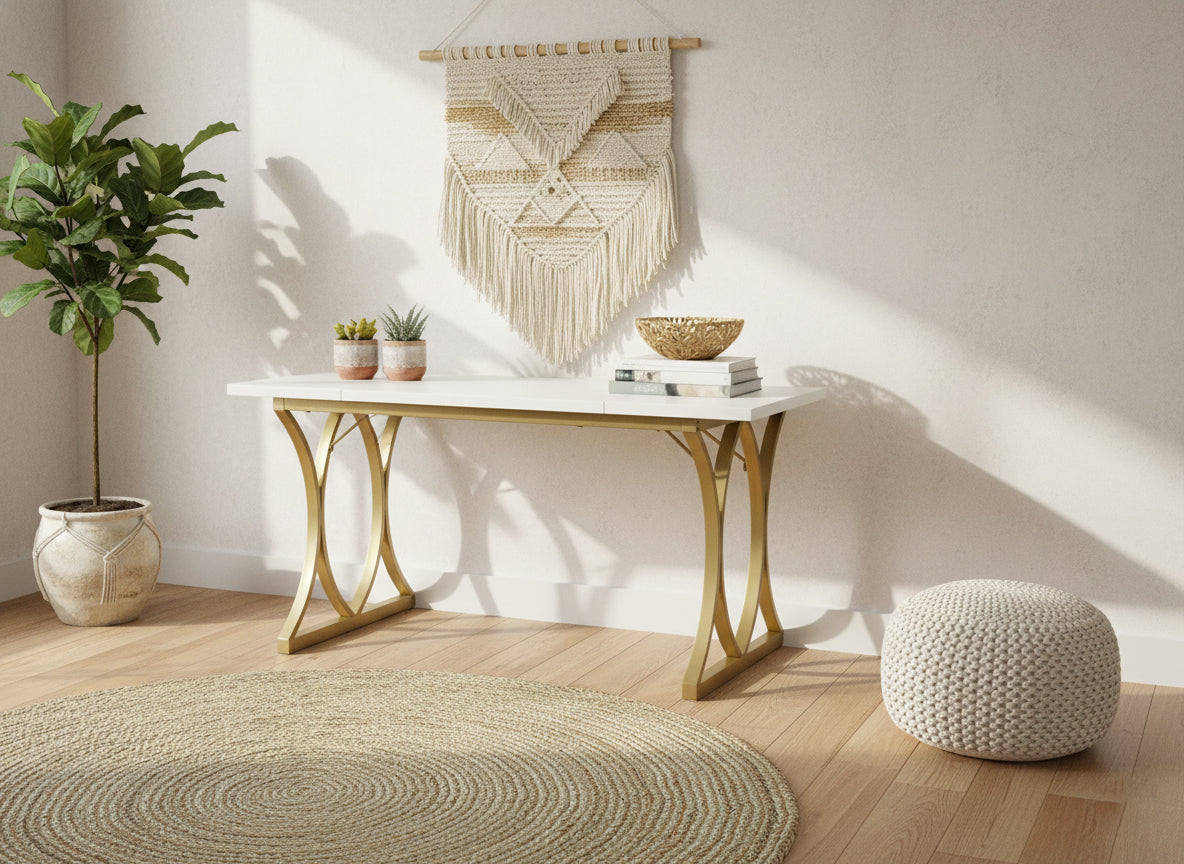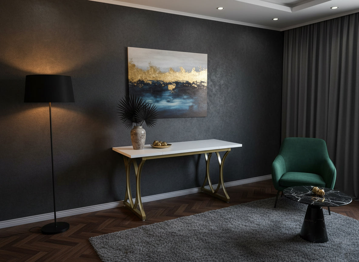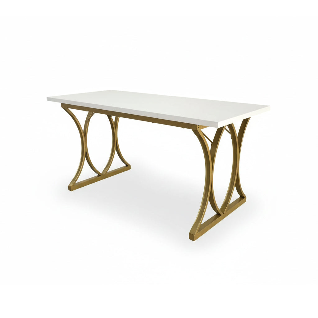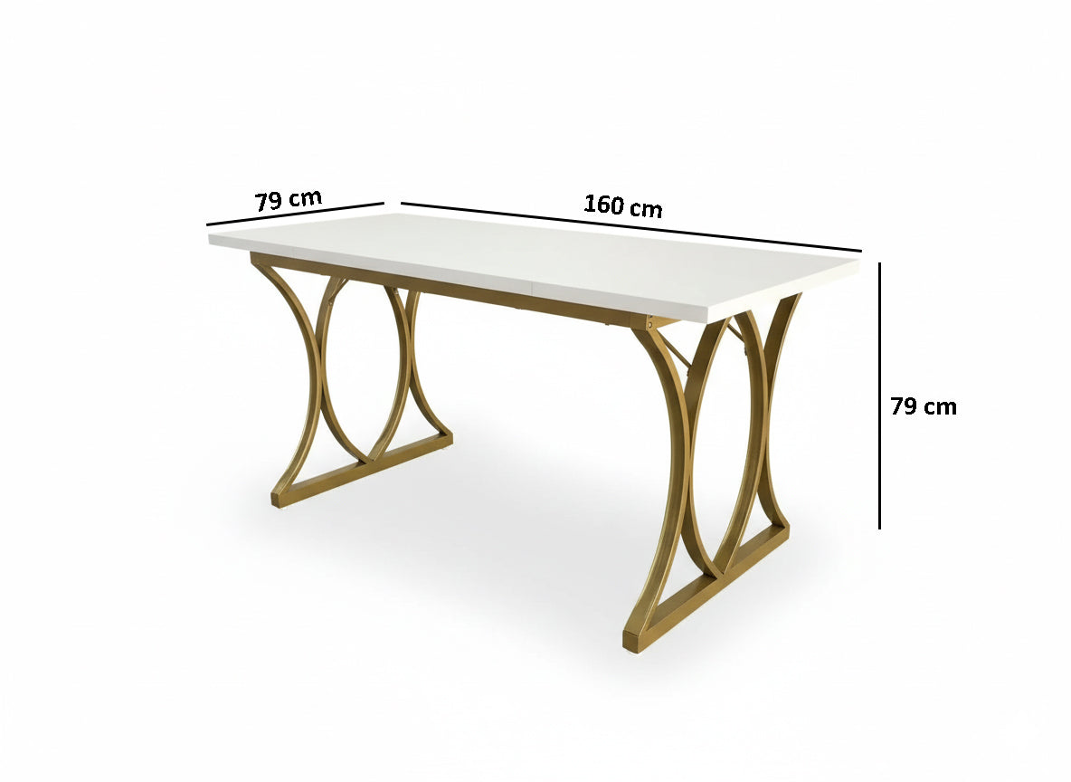 Teremtsen inspiráló környezetet a munkához vagy az étkezéshez a Dollcini Otthon legújabb dizájnasztalával! A sima, hófehér asztallap és a szaténfényű, ívelt arany lábak letisztult kontrasztja modern, mégis kifinomult megjelenést kölcsönöz bármely térnek.