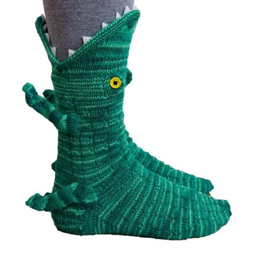 Designul șosetei este inspirat de un crocodil jucăuș: modelul croșetat este texturat continuu, imitând pielea solzoasă a crocodilului. Detaliile cusute - ochii ieșiți în evidență, forma nasului, brațele, picioarele și o gură deschisă care „mușcă” - dau viață șosetei. E ca și cum un mic prădător verde ar trăi chiar pe picioarele tale!