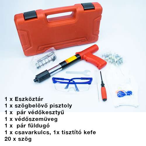 Conținutul pachetului 1x pistol de cuie, 1x mănușă, 1x ochelari, 1x dopuri pentru urechi, 1x cheie, 1x perie, 1x manual, 20x cuie rotunde.